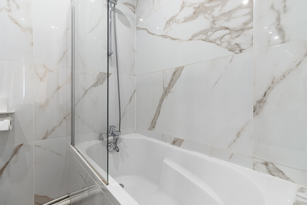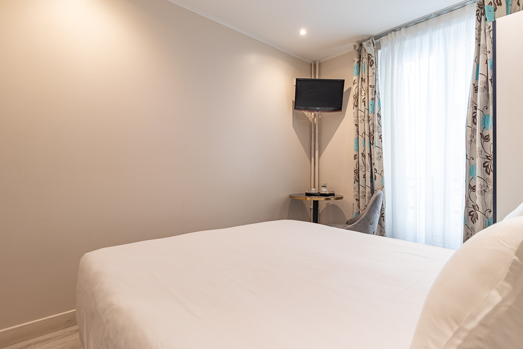 Chambre d'hôtel lumineuse avec lit double et fenêtre.