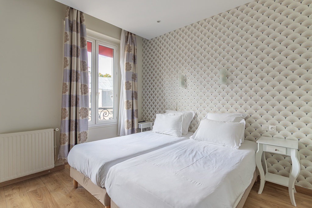 Chambre d'hôtel lumineuse avec lit double et fenêtre.
